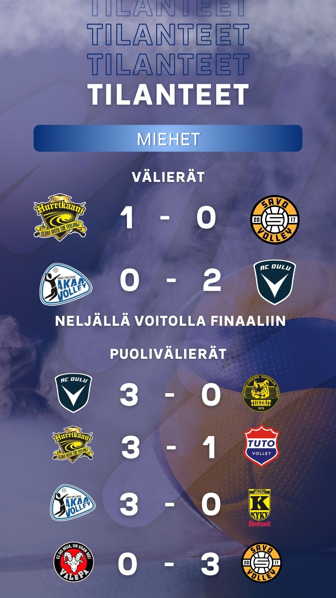 Miesten Mestaruusliigan välierät saivat säkenöivän alun torstaina. Liiganousija AC Oulu Volley haki 3-1 -avausvoiton hallitsevasta mestarista Akaa-Volleysta ja Savo Volley piiinasi runkosarjan ykkösen Hurrikaani-Loimaan viiteen erään. pudotuspeleissä kuitenkin vain ”voitot lasketaan” ja ottelusarja Hurrikaanille 1-0.