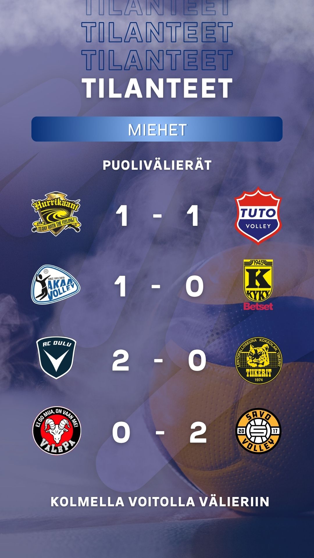 Mitä AC Oulu Volley ja Kokkolan Tiikereit löivät alulle perjantaina, jatkoivat siitä muut miesten puolivälieräjoukkueet lauantaina: räväkkä startti oikeastaan kaikille sarjoille. Savo Volley haki vierasvoiton VaLePasta, TUTO Volley piinasi Loimaalla Hurrikaanin viidenteen erään ja KyKy-Betsetkin haastoi Akaa Volleyn kunnon taistoon.