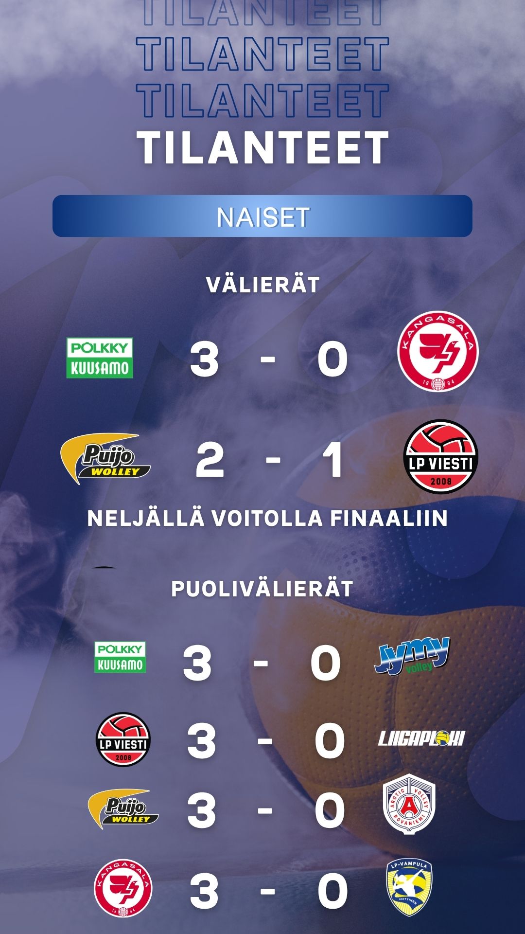 LP Viesti ei jättänyt tiistaina jossiteltavaa vaan voitti edellispäivän niukasta tappiosta toivuttuaan hallitsevan Suomen mestarin Puijo Wolleyn 3-0 (28-26, 25-17, 26-24) kaventaen välieräsarjan voitot 1-2:een. Pari jatkuu ensi viikonloppuna siis Kuopiossa kahdella pelillä