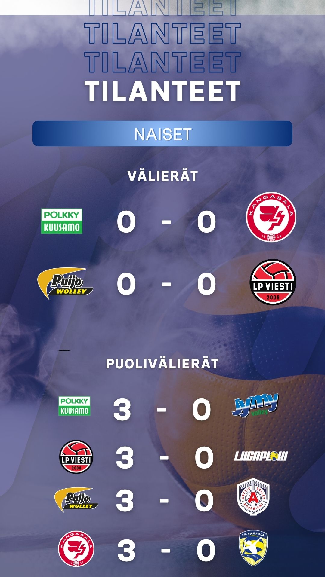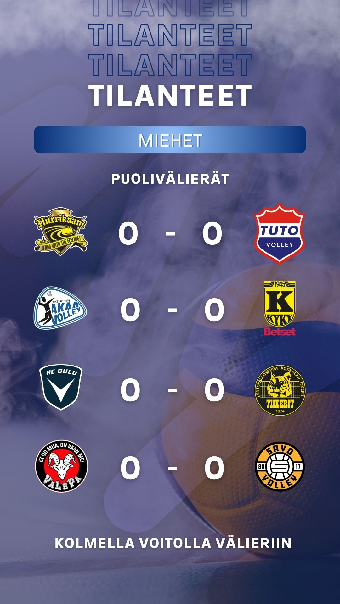 Miesten puolivälierien otteluohjelmat ovat seilvillä. Ensimmäisen käyntiin lähtee perjantaina AC Oulu Volley - Kokkolan Tiikerit ja muut ottelusarjat lauantaina.
