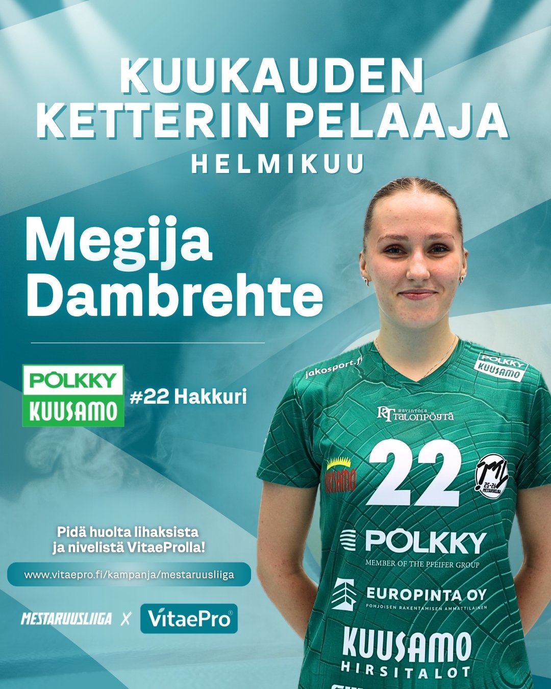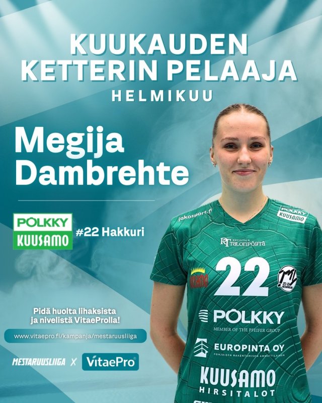 Pölkky Kuusamo pelasi helmikuusa viisi ottelua keräten niistä täydet sarjapisteet erävoitoin 15-1. Latvialaishakkuri Dambrehte teki peleihin keskimäärin 14,8 pistettä 11,4 teholla. Hyökkäysprosentti oli komea 51. 23-vuotiaalle Dambrehtelle valinta oli uran toinen. Maaliskuussa 2025 latvialaishakkuri palkittiin ensimmäisen kerran.