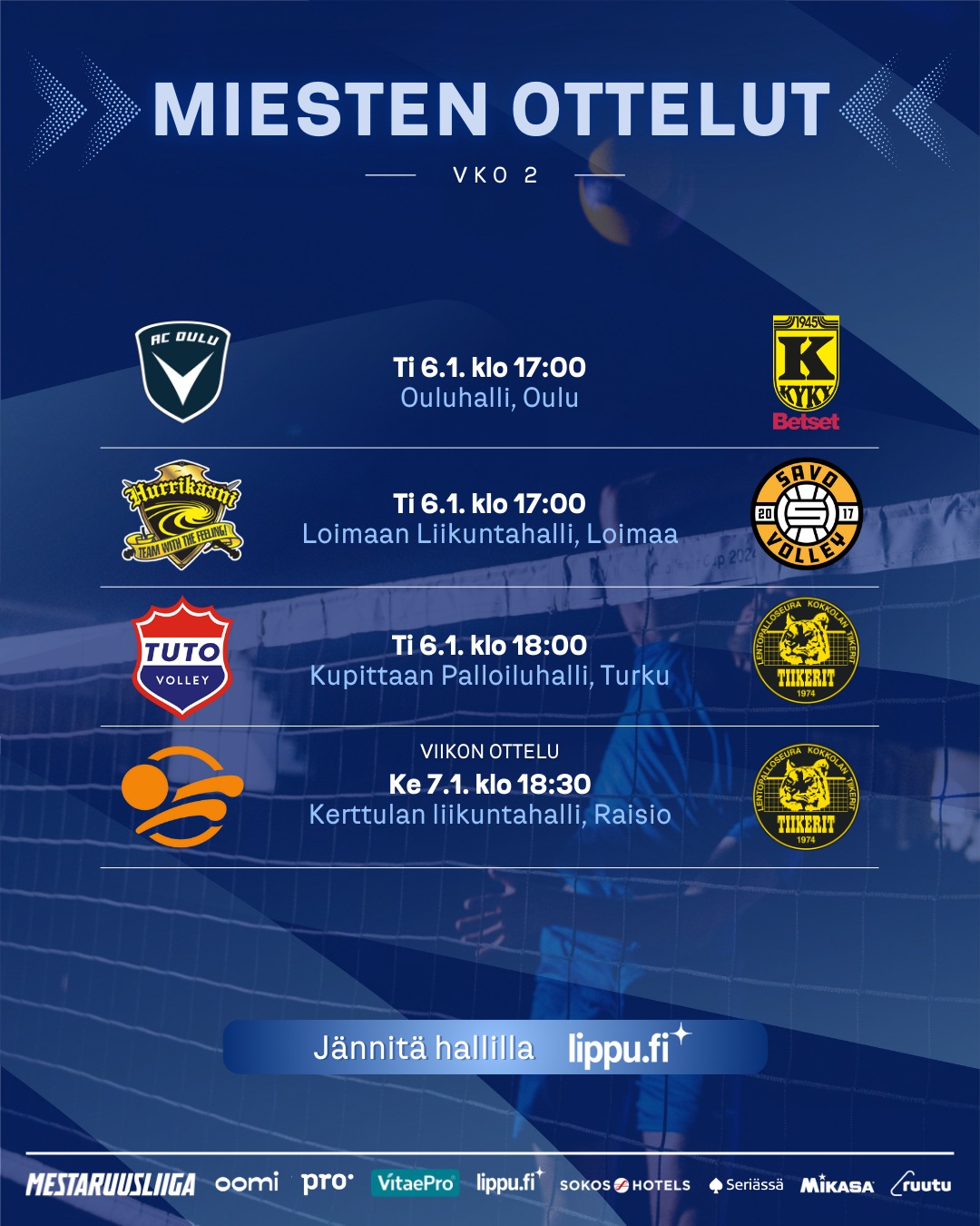Heti loppiaisen seitsemästä pelistä selviydyttyä pelataan keskiviikkona 7.1. Ruudun ja Mestaruusliigan Viikon ottelu Raisiossa. Todella tärkeistä pisteistä pelaavat kaksi kertaa voittanut viimeisenä liigassa oleva Raision Loimu (2-12, 7 pist.) ja seitsemäntenä ensimmäistä vierasvoittoaan vielä hakeva Tiikerit (4-12, 15 pist.). Tiikerit tulee peliin edellisillan TUTO Volleyle kärsimästään 2-3 -tappiosta sisuuntuneena. Loimulla kolme tappiota alla. Tiikerit hävinnyt seitsemän kahdeksasta edellisestä ottelusta Neljä edellistä kohtaamista joukkueiden kesken ovat päättyneet kotivoittoihin.