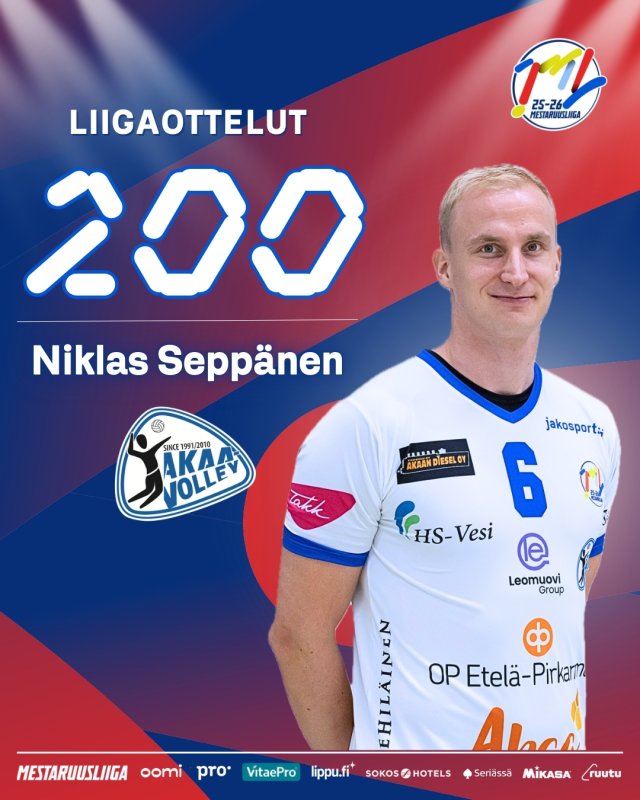 Akaa-Volleyn Niklas Sepäänen pelasi tiistaina uransa 200. ottelun Mestaruusliigassa.